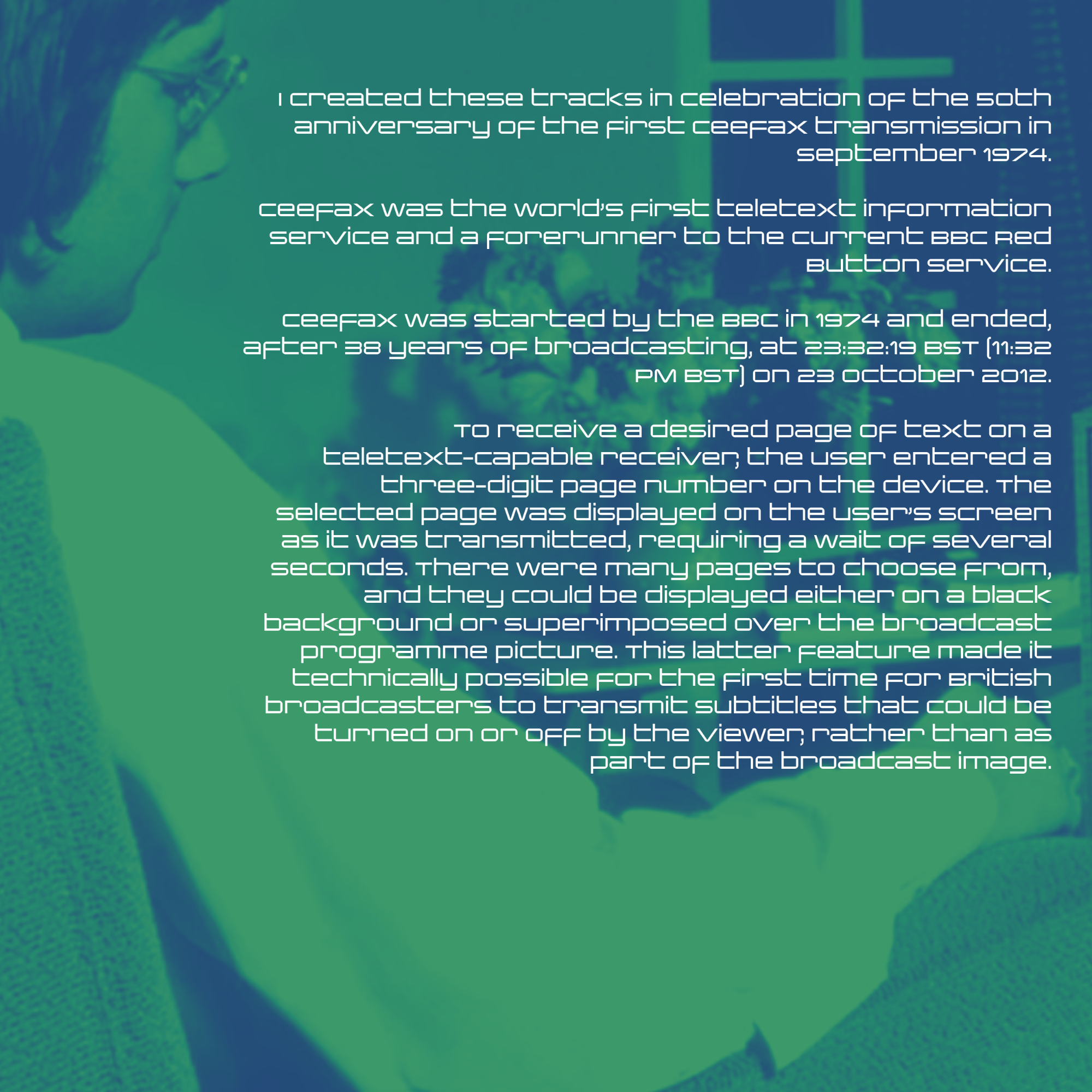 Celebrating the 50th anniversary of the first Ceefax transmission in September 1974.